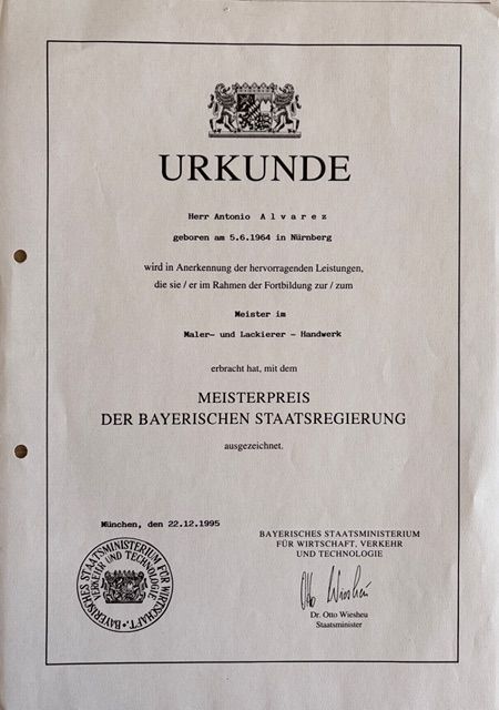 Offizielles Schreiben der Handwerkskammer zur Bestätigung der Verleihung des Meisterpreises der Bayerischen Staatsregierung.